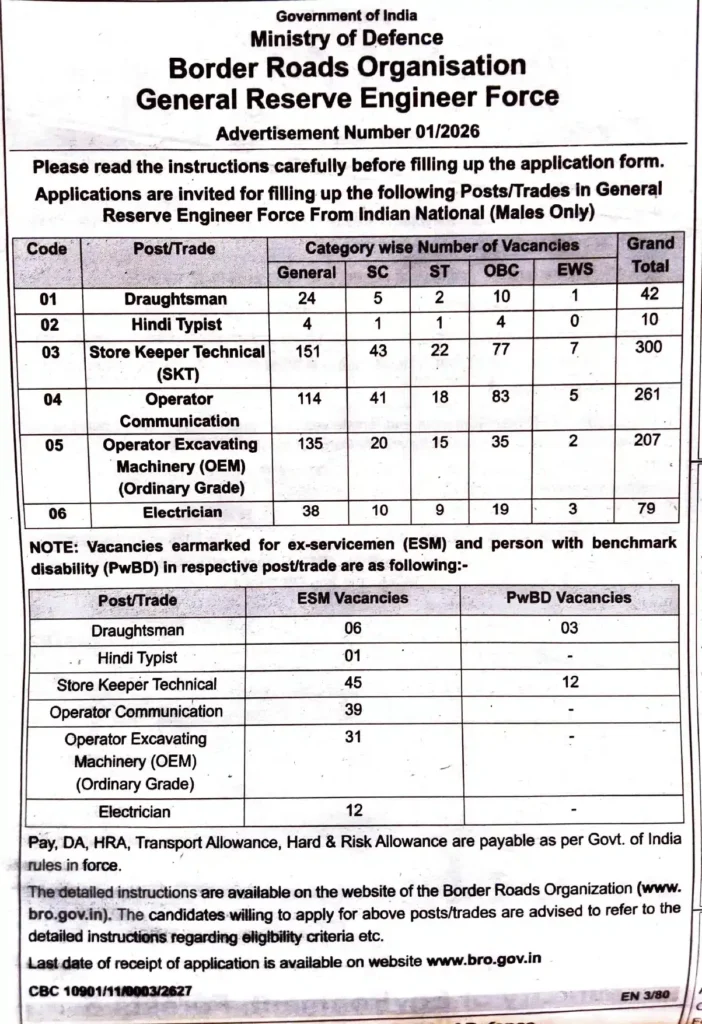 BRO GREF Technical & Non-Technical Recruitment 2026 is a major opportunity for candidates looking to secure a government job under the Ministry of Defence. The Border Roads Organisation (BRO), functioning under the General Reserve Engineer Force (GREF), has officially released Advertisement No. 01/2026 inviting applications for 899 vacancies across various technical and non-technical posts. This recruitment drive is especially beneficial for candidates with 10th, 12th, and ITI qualifications who want to work in a prestigious defence-related organisation.