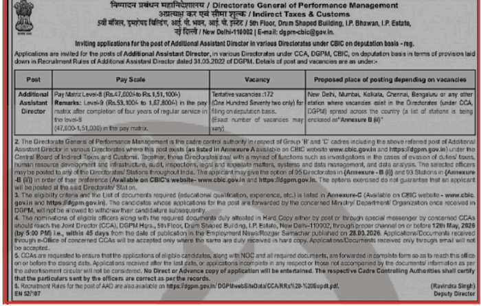 CBIC Additional Assistant Director Recruitment 2026 has been officially announced, offering a great opportunity for eligible government officers to work under the Central Board of Indirect Taxes and Customs (CBIC). This recruitment is being conducted on a deputation basis for multiple vacancies across India. If you are looking for a stable and prestigious government role, this notification deserves your attention.