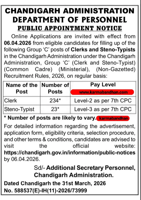 Chandigarh Administration Recruitment 2026 has officially been announced, offering a great opportunity for candidates looking for government jobs. The Department of Personnel, Chandigarh Administration has released a public appointment notice for Clerk and Steno-Typist posts under Group ‘C’ category. Interested candidates can apply online from 06 April 2026 through the official website.