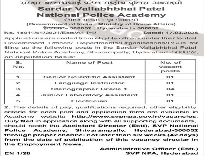 SVPNPA Vacancy 2026 notification has been officially released by the Sardar Vallabhbhai Patel National Police Academy (SVPNPA), Hyderabad, under the Ministry of Home Affairs. This recruitment drive invites applications from eligible officers working in Central Government departments and PSUs for multiple posts on a deputation basis. Interested candidates must apply through the proper channel before the last date 16 May 2026.