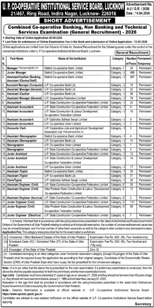 The UPCISB Cooperative Recruitment 2026 Notification has been officially released, bringing a massive opportunity for candidates seeking government jobs in Uttar Pradesh. The U.P. Co-operative Institutional Service Board (UPCISB), Lucknow has announced recruitment for 2000+ vacancies under banking, non-banking, and technical categories. This recruitment drive includes posts like Manager, Clerk, Assistant, Accountant, and Junior Engineer across multiple cooperative institutions.